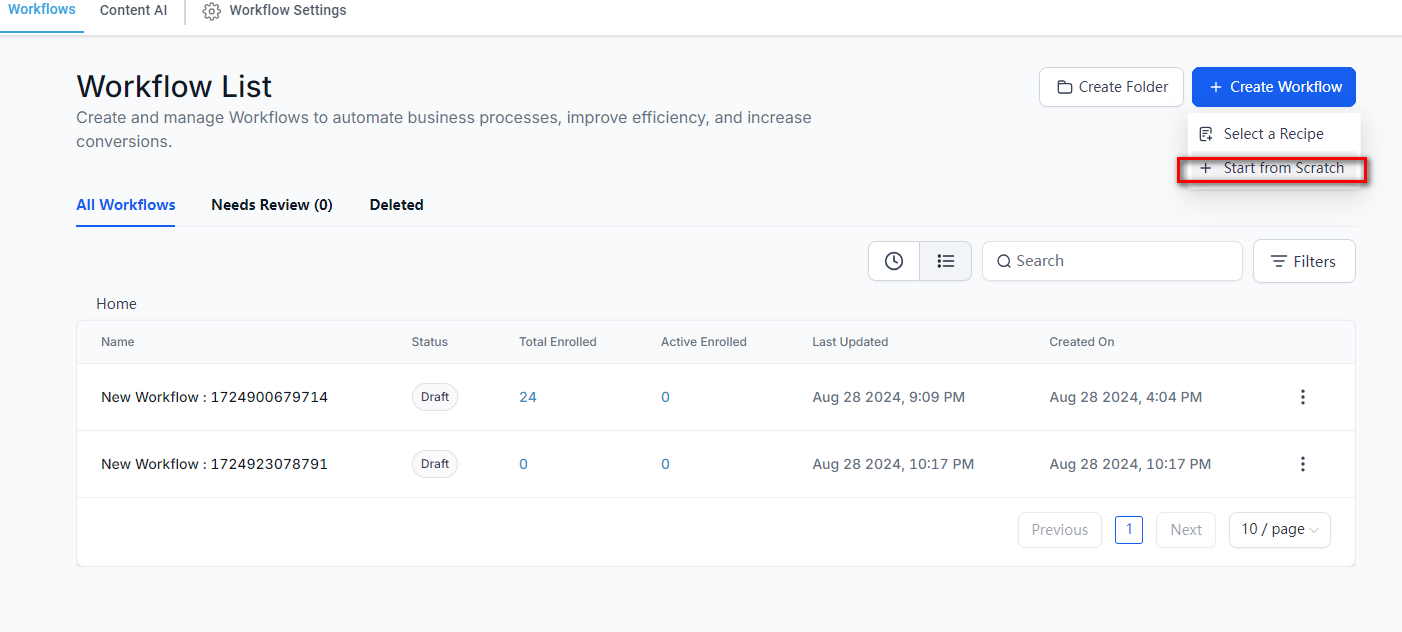 On Workflows page, click “Create Workflow” button, then choose “Start from Scratch” option.